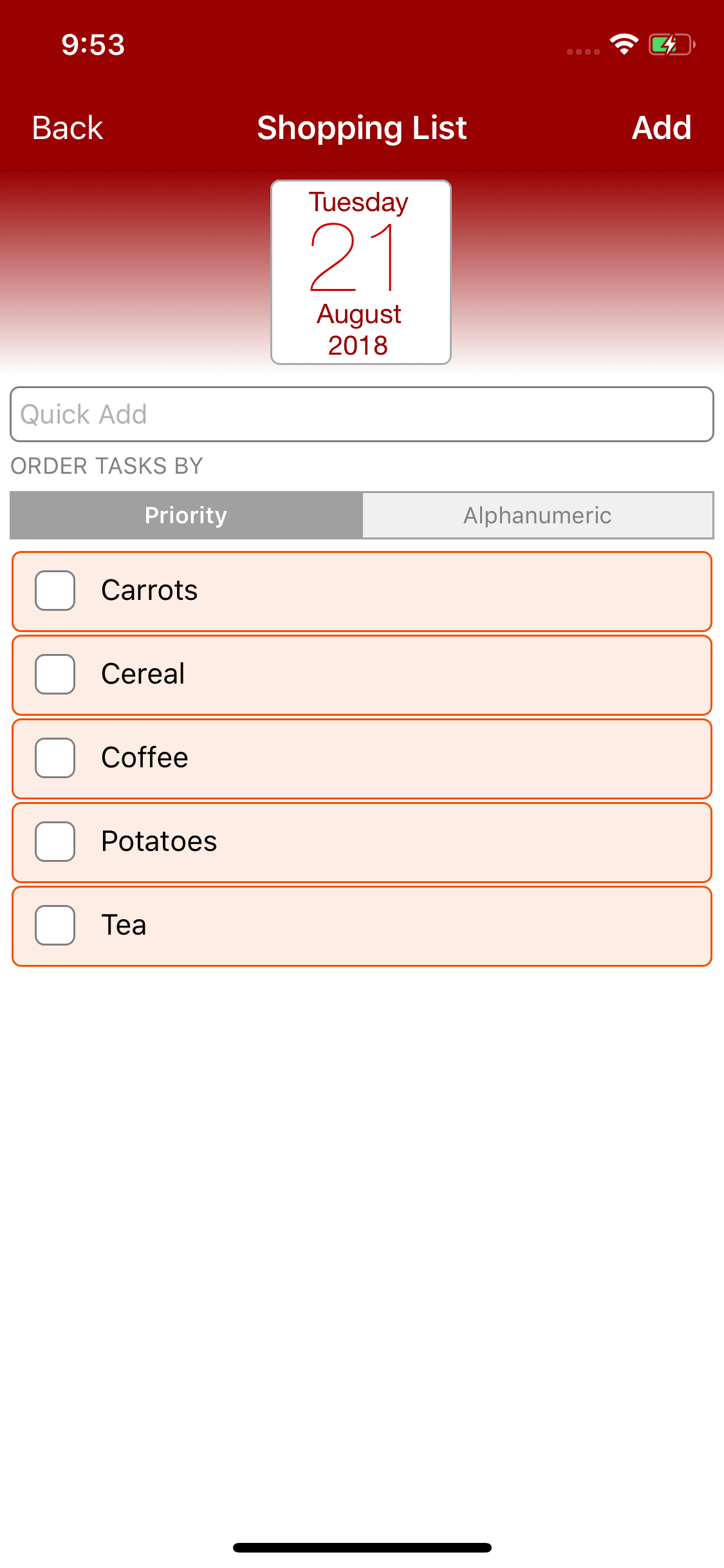 You can change the order of your tasks, by default they are sorted by Priority which actually means task priority then overdue number of days, then by task title. The Alphanumeric option orders tasks simply by title.