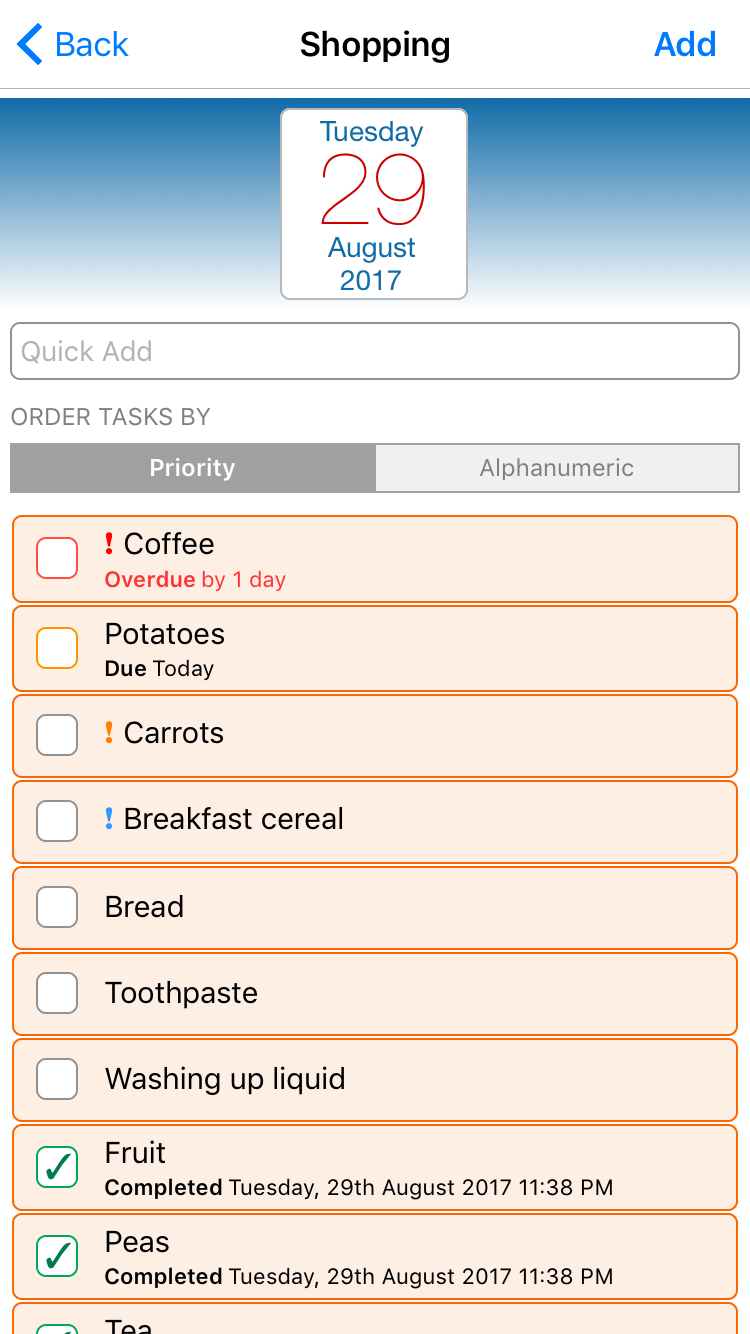 You can change the order of your tasks, by default they are sorted by Priority which actually means task priority then overdue number of days, then by task title. The Alphanumeric option orders tasks simply by title.